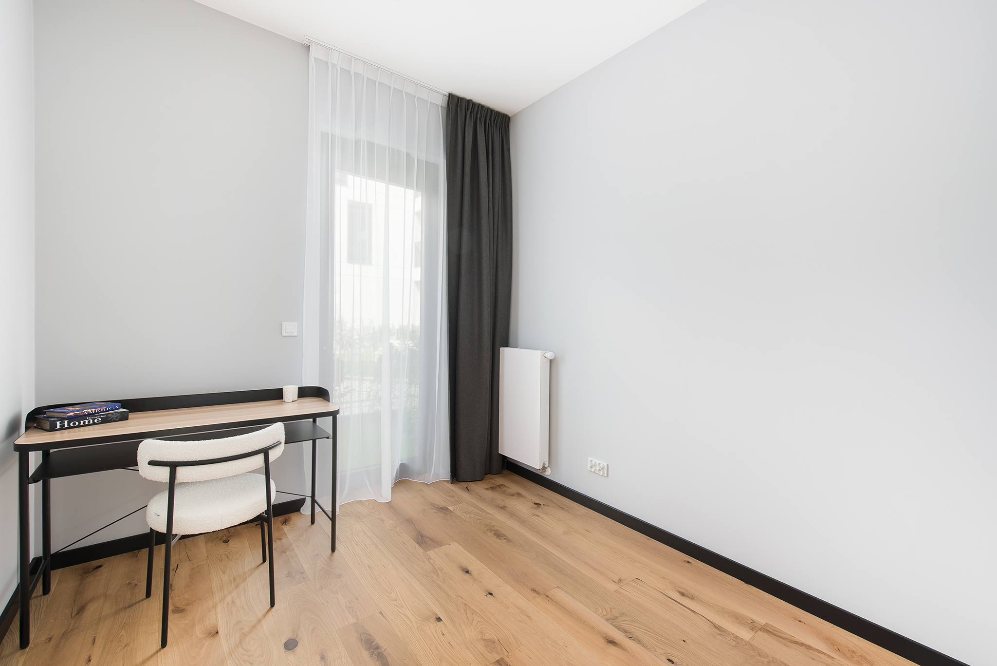 - Wykończenie: pod klucz, wysoki standard – m.in. meble na wymiar, drewniana podłoga
